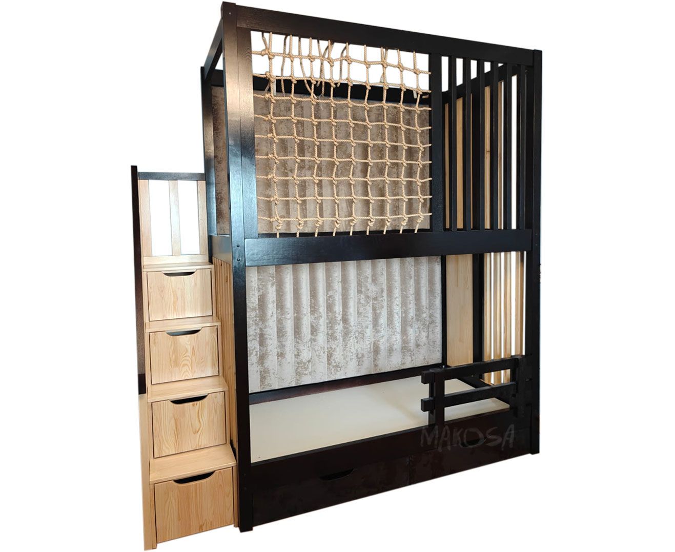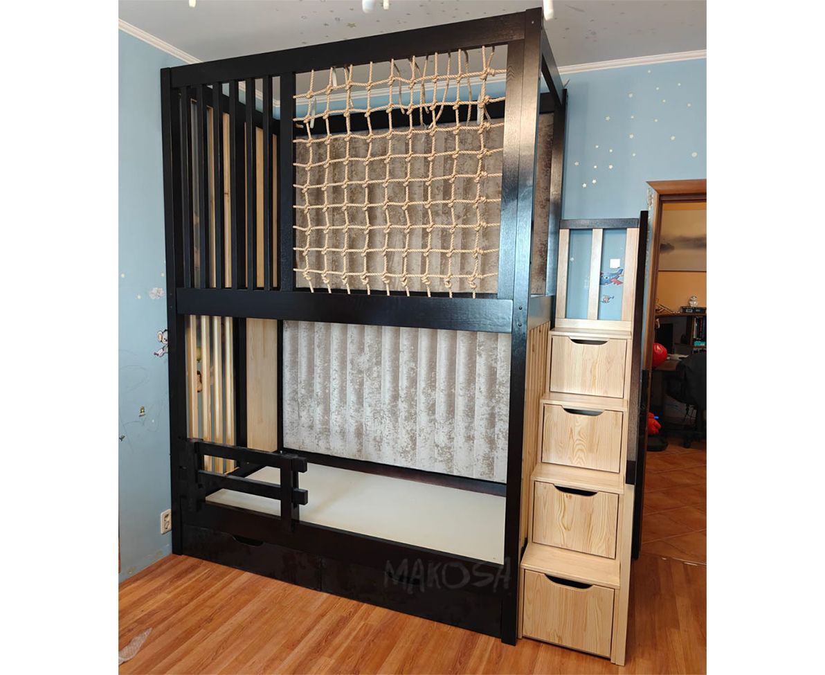 Двухъярусная кровать с балдахином, мягкими панелями и сеткой Авокадо. Кровать удобная и роскошная, как премиальная каюта трансатлантического лайнера. Много натурального дерева, комфортные спальные места, отсеки для хранения, интерьерные детали - все это умещено на небольшом пространстве площадью чуть больше двух метров. Каркас под балдахин служит дополнительными ребрами жесткости, таким образом укрепляя кровать. Вы можете использовать каркас кровати для декорирования его шторами и другими игровыми элементами.