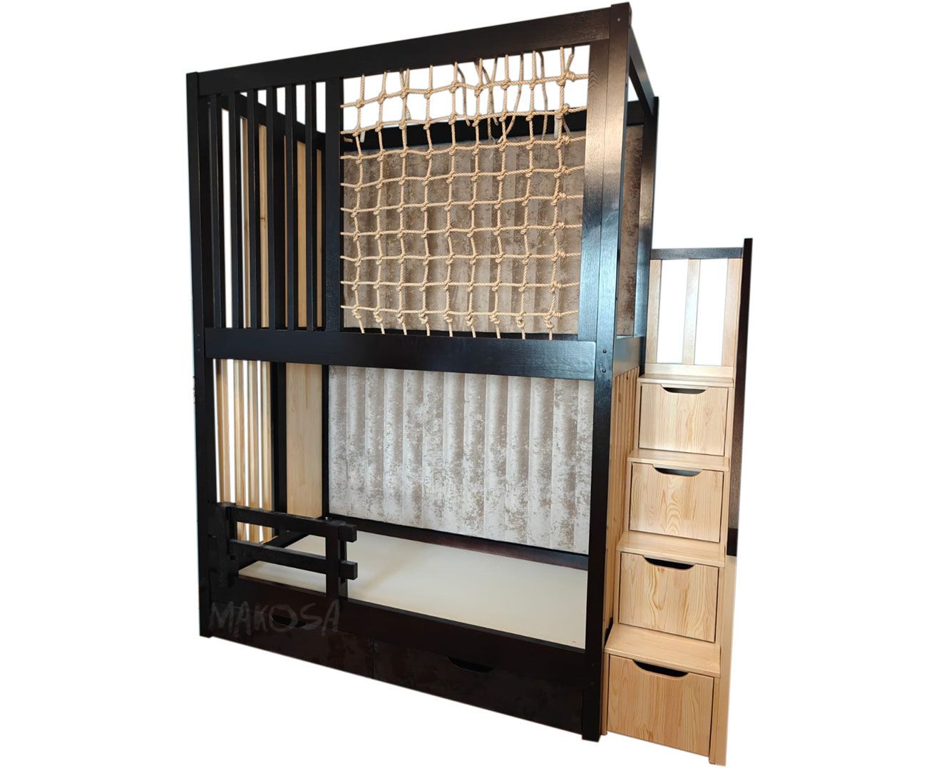 Комплектация модели: Спинка 2 шт, Царга 4 шт, Каркас балдахина 2 шт, Панель фронтальная с вертикальными планками 1 шт, Сетка (белая или натуральная) 1 шт, Лестница-комод 1 шт, Ящики 1 ком. (2 шт), Подматрасники 2 ком. (16 шт), ДВП 2 шт., рейки изголовья и изножья, передний съемный бортик, глухие панели изголовья - 2 шт.