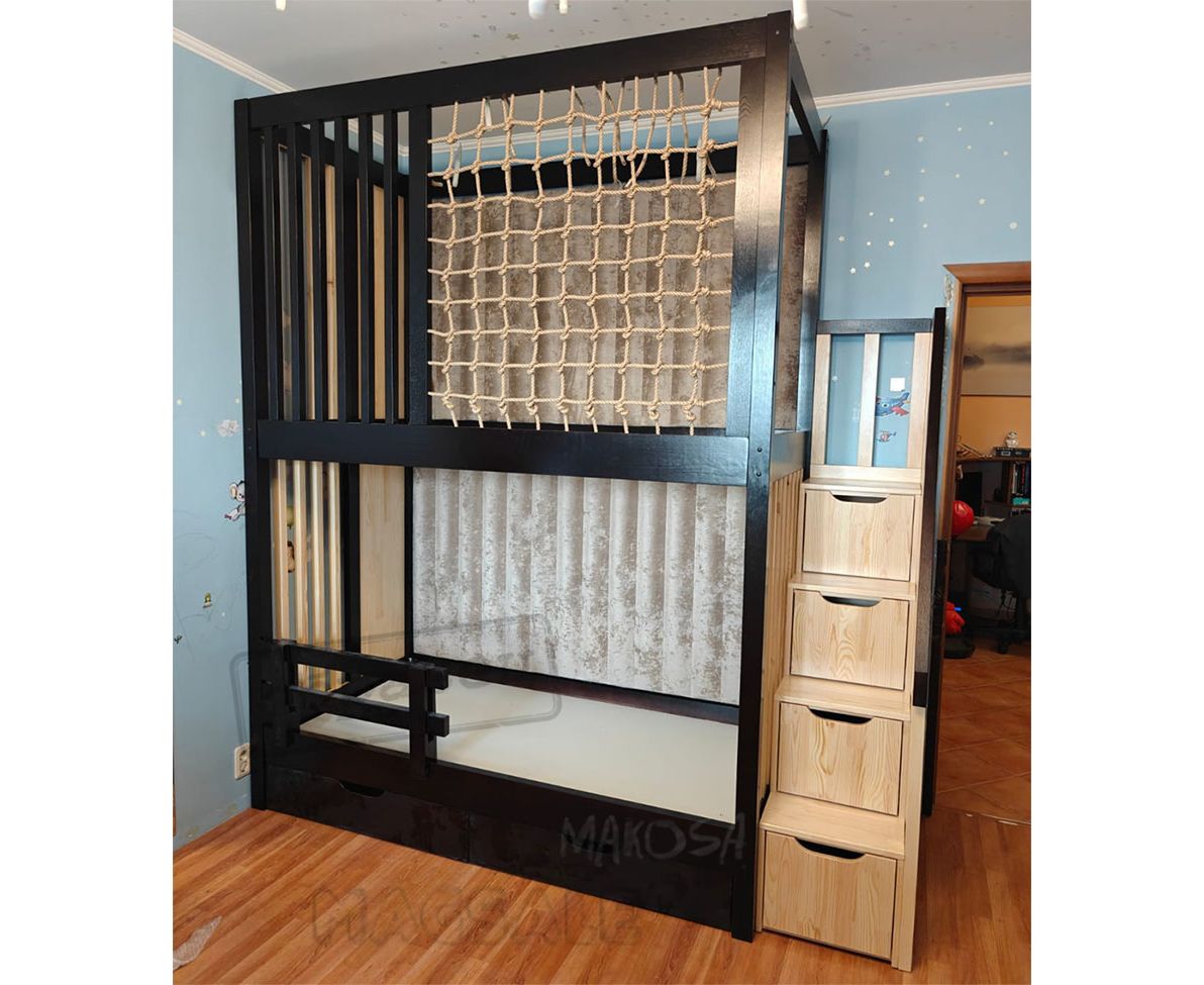 Два спальных места, два ящика, лестница-комод, сетка, передний бортик.