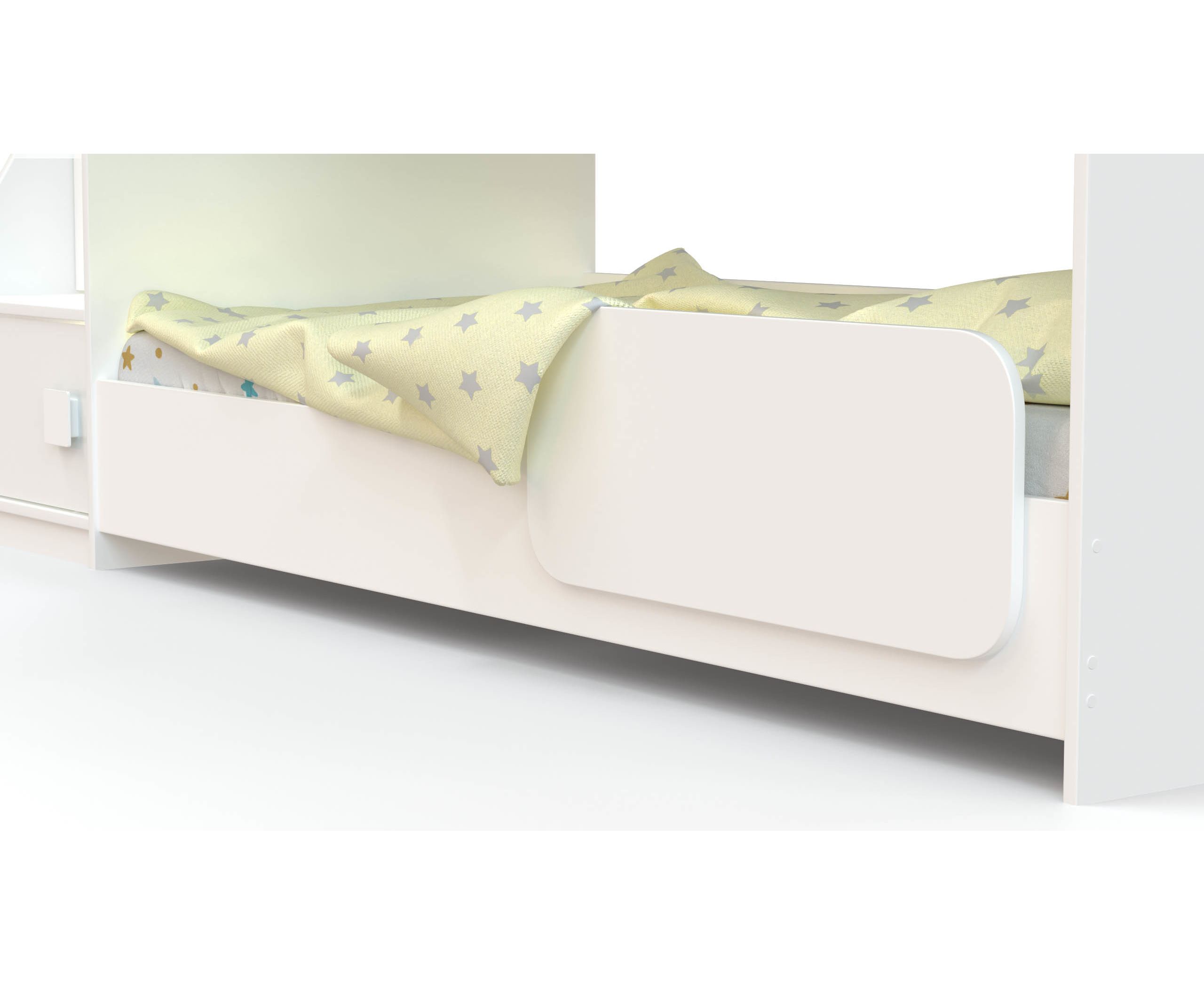 - Высота кровати всего 1405 мм. Верхний ярус оборудован спальным местом с высокими боковыми бортиками для безопасного сна и отдыха ребенка.