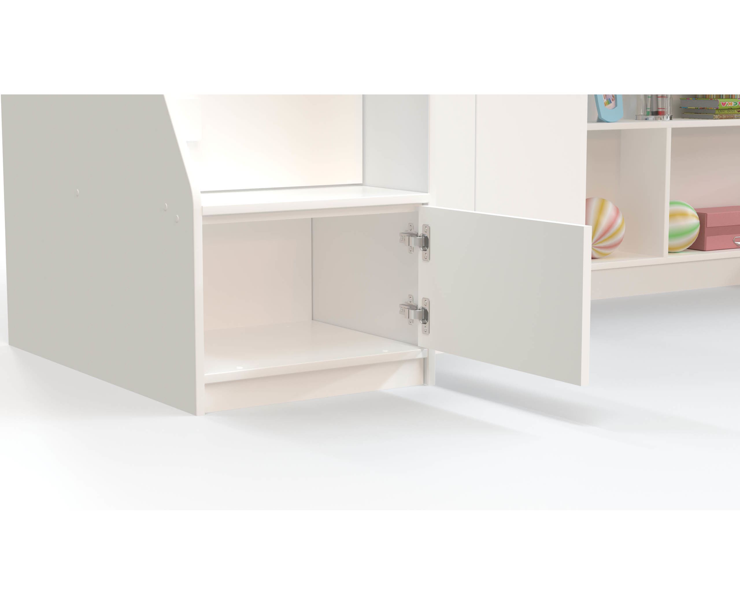 - На нижнем ярусе располагается свой игровой уголок для ребёнка, стеллаж с тремя вместительными полками для игрушек и вместительный угловой шкаф для хранения одежды, белья, игрушек или иных вещей.