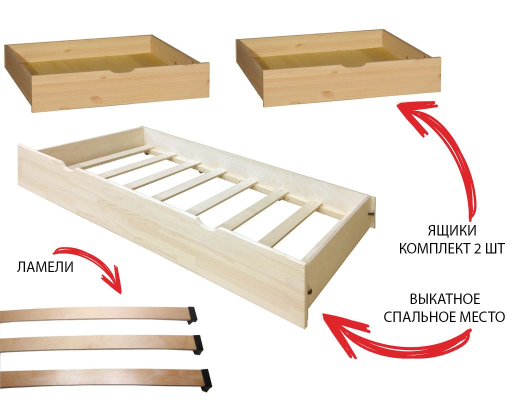 Комплектация модели: Спинка 2 шт, Царга 2 шт, Каркас крыши 1 шт, Планки 6 шт, Лестница 1 шт, Подматрасники 1 ком. (8 шт), ДВП 1 шт..