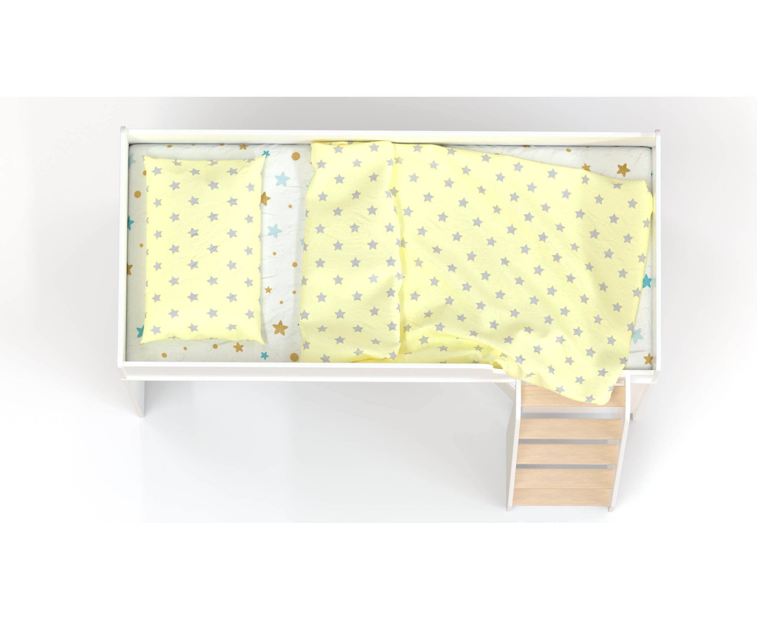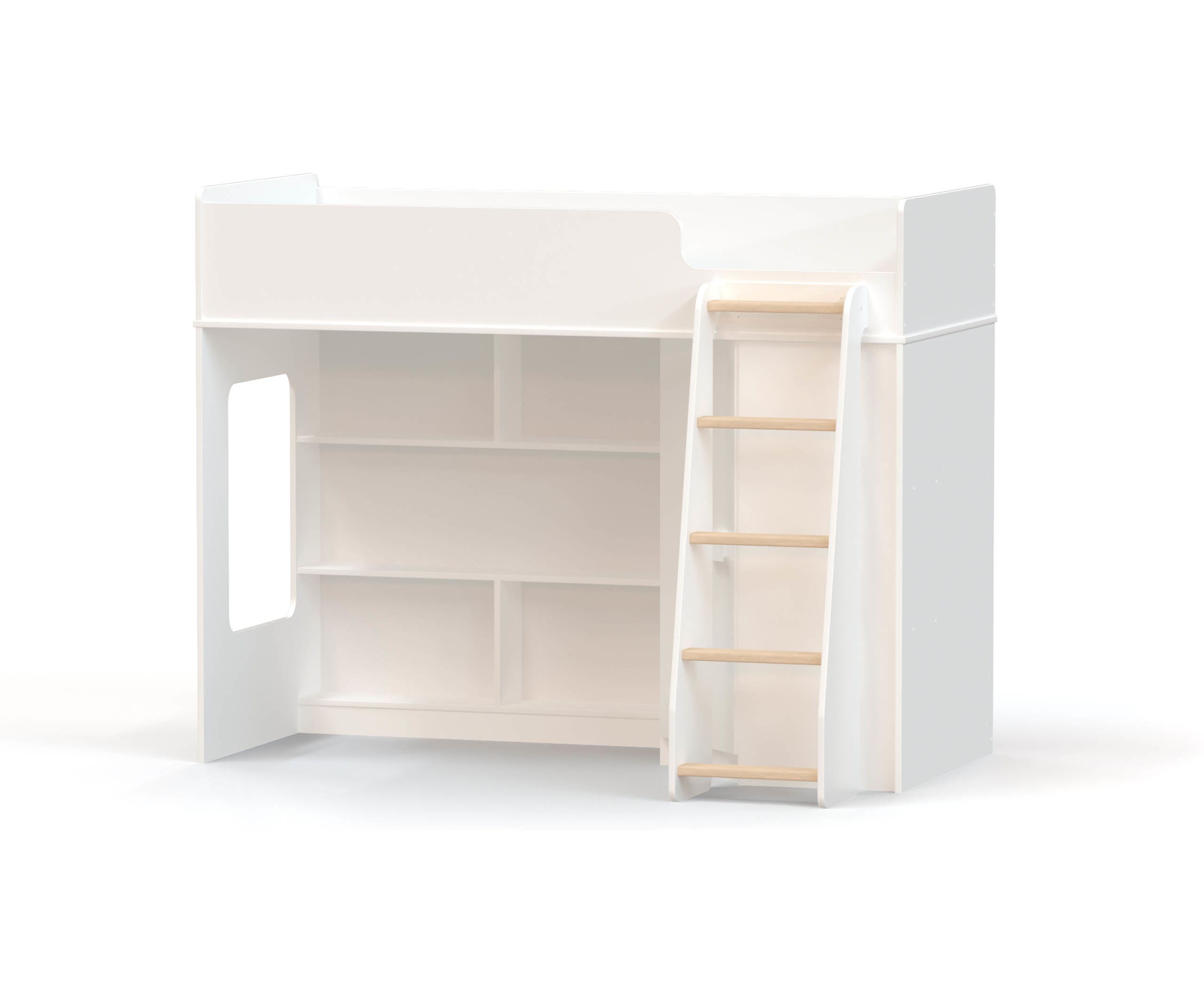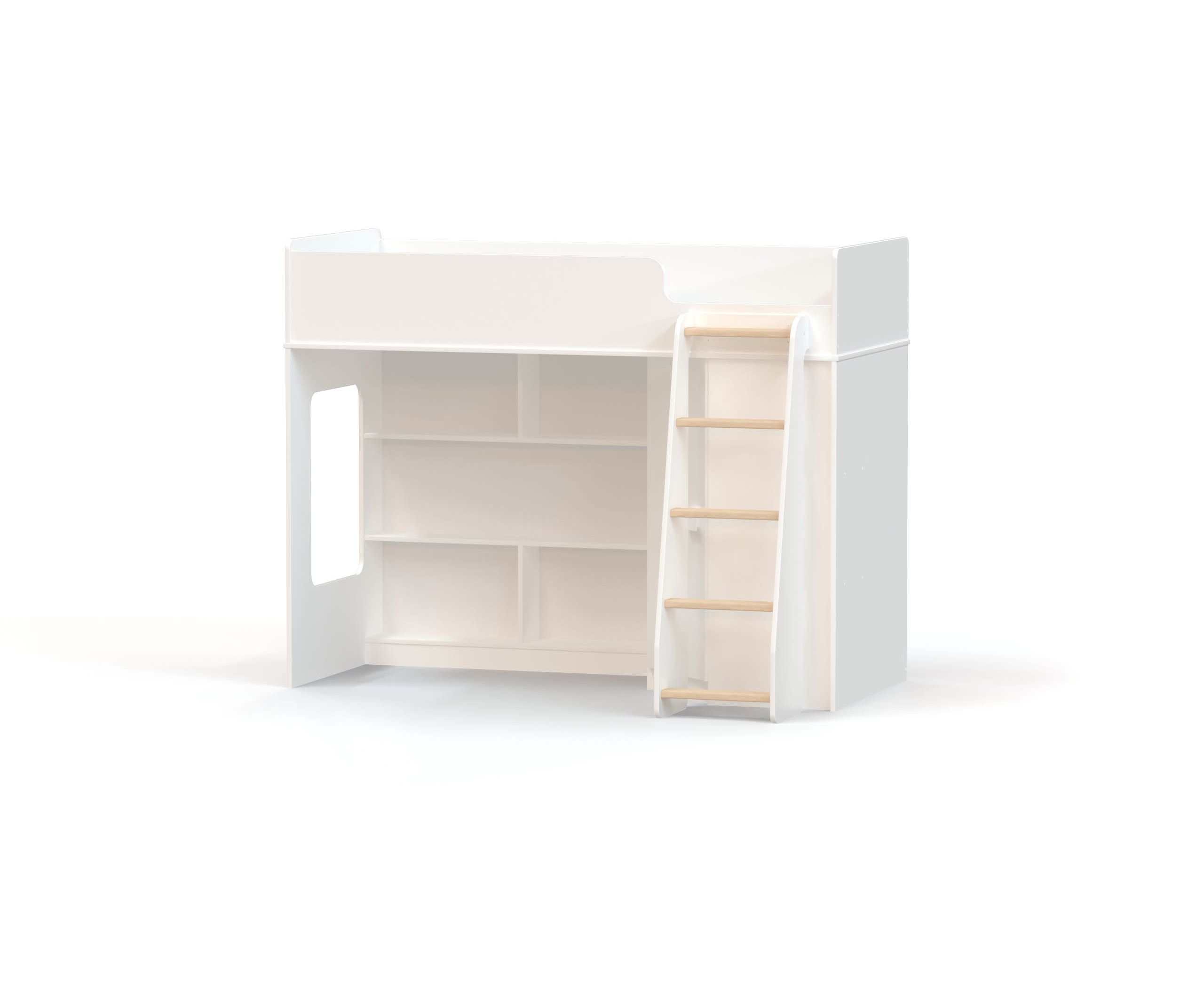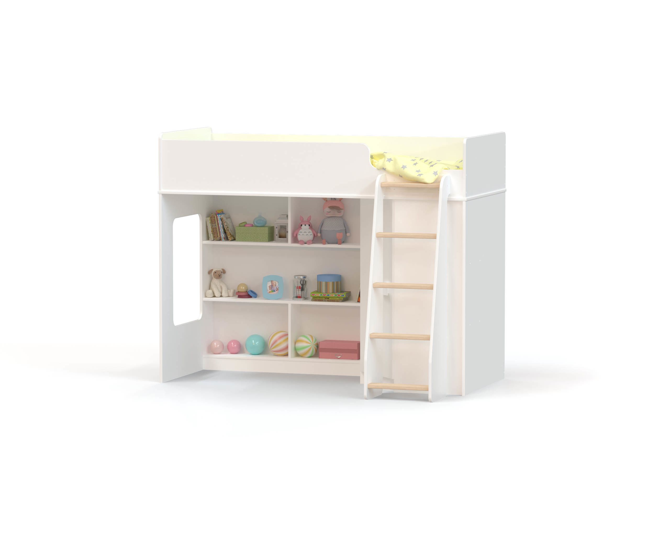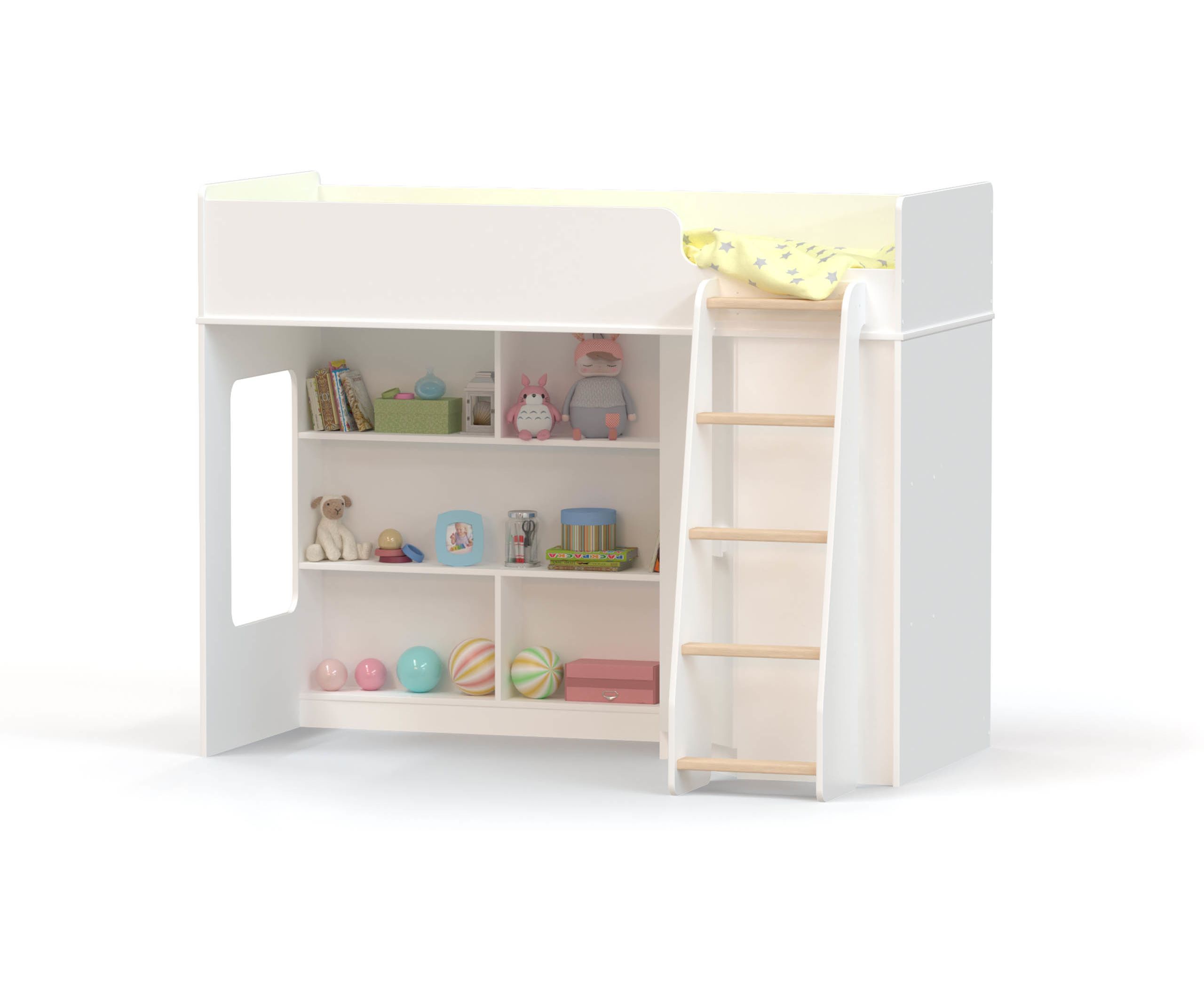 - В торце нижнего яруса кровати световое окошко даст дополнительное естественное освещение. Для подъема и спуска предусмотрена четырехступенчатая прямая лестница с перекладинами.