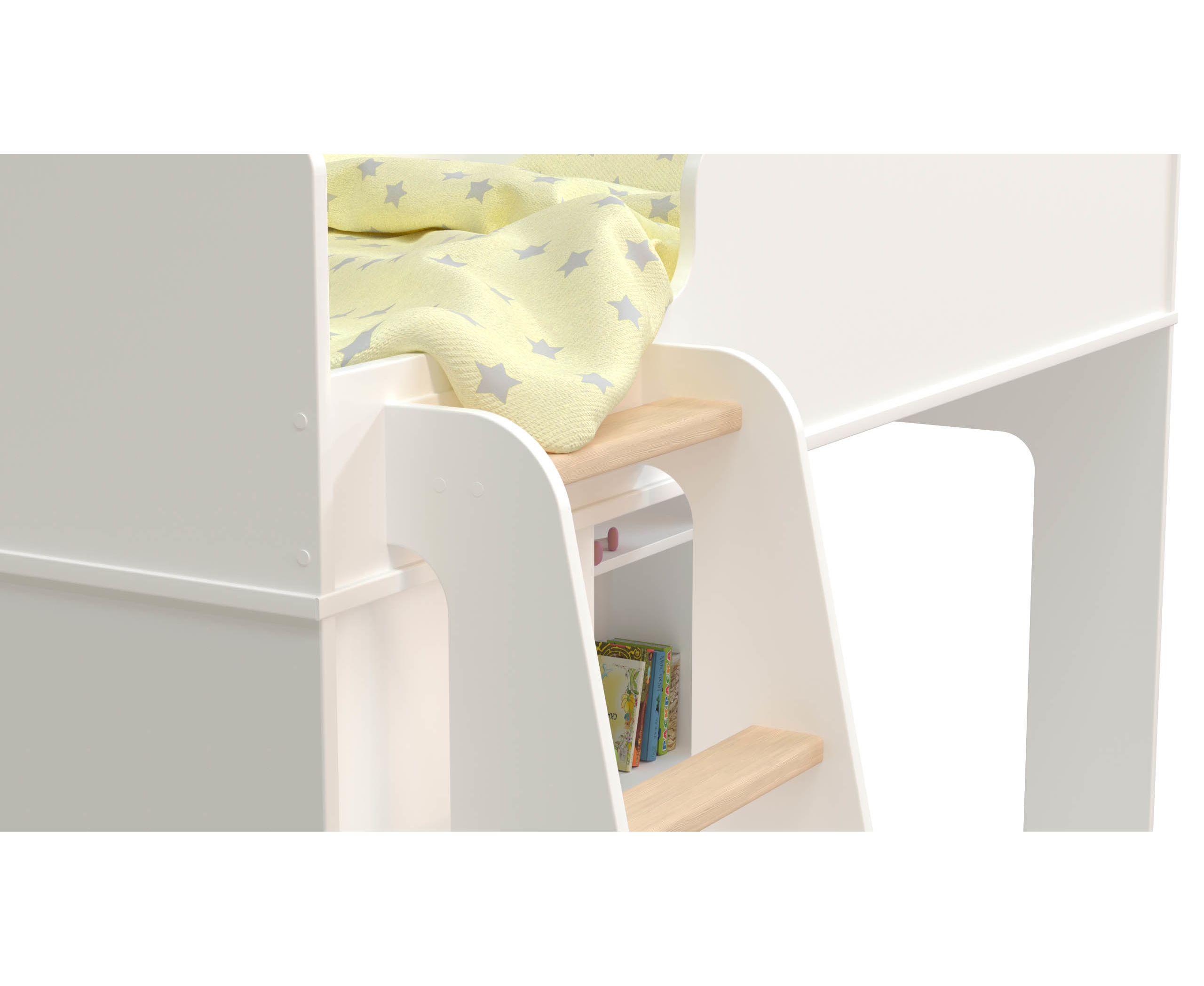 - Прочные ступеньки изготовлены из массива сосны и покрыты лаком. Подъем и спуск по лестнице способствует физическому развитию ребенка.