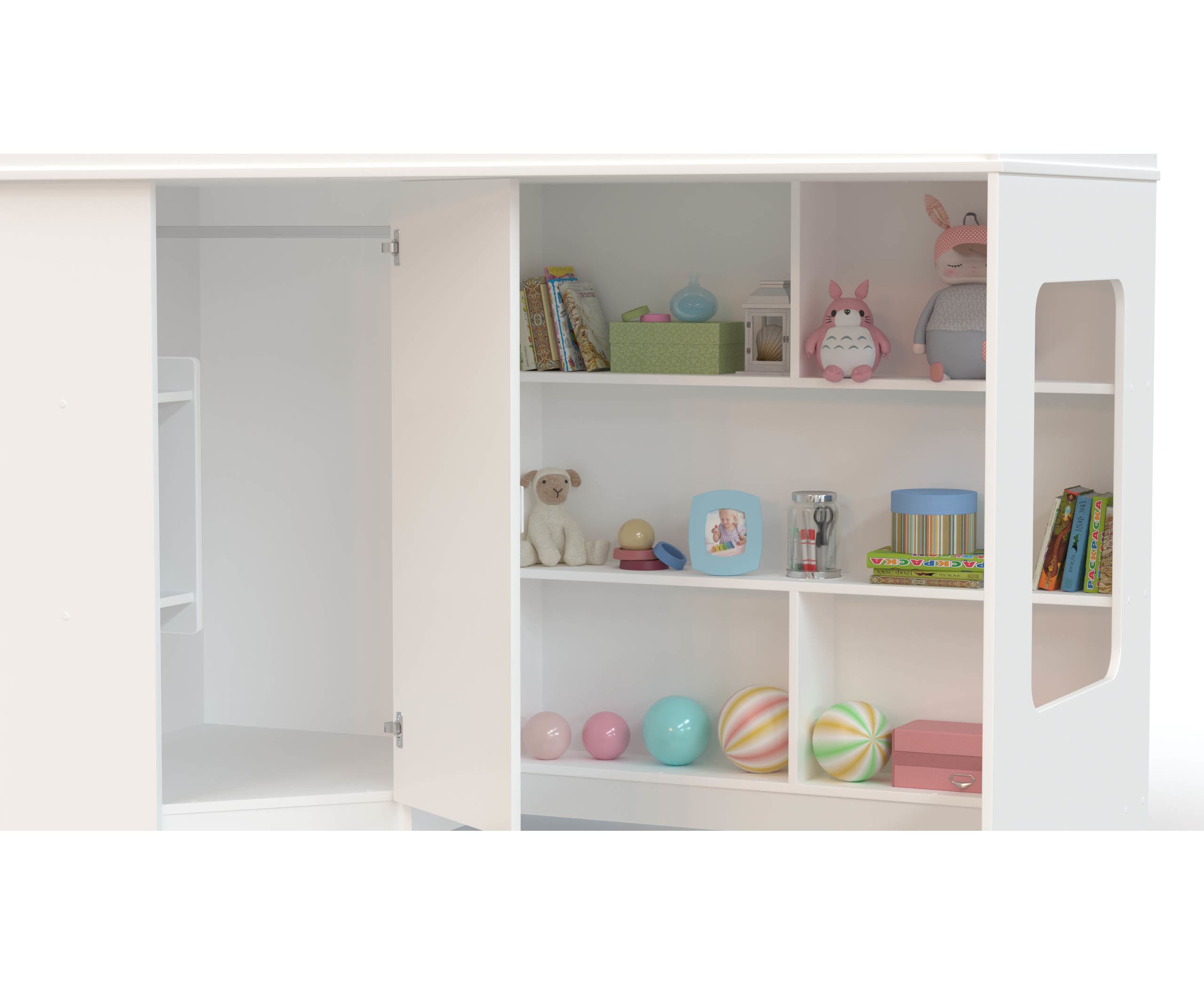 - На нижнем ярусе располагается свой игровой уголок для ребёнка, стеллаж с тремя вместительными полками для игрушек и вместительный угловой шкаф для хранения одежды, белья, игрушек или иных вещей.