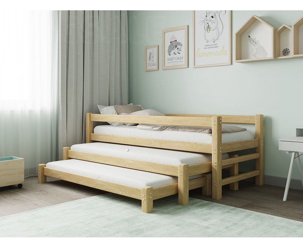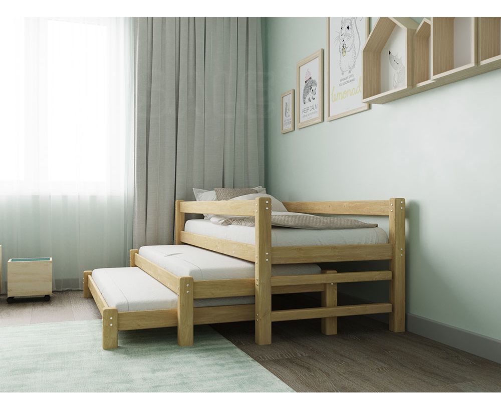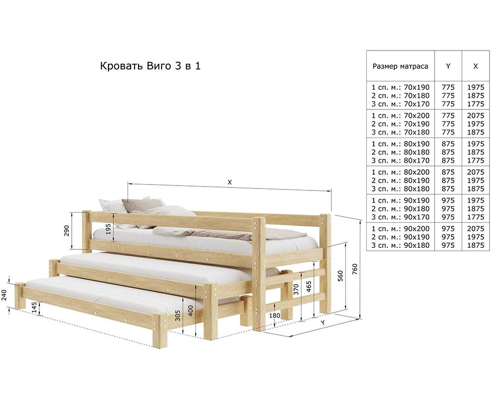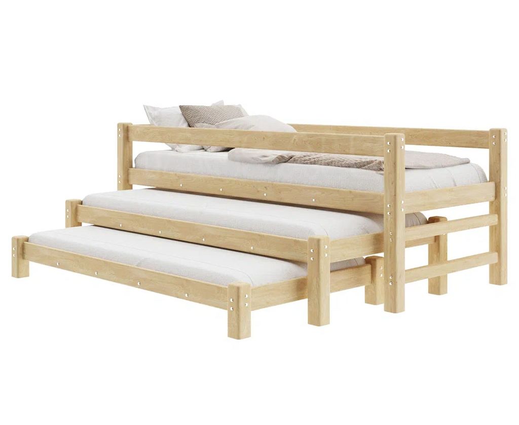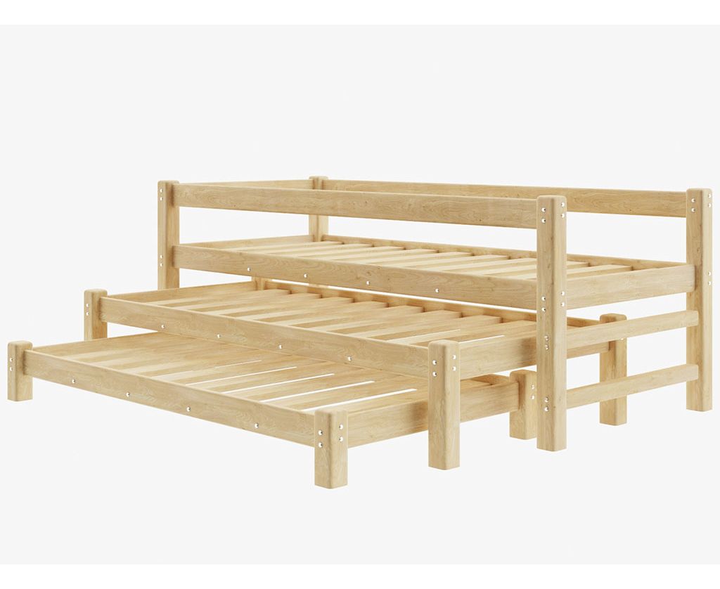 Раздвижная кровать 3-в-1 из массива сосны Виго. Модель кровати с выдвижным местом 2-в-1 представлена практичной, прочной и компактной конструкцией. Прекрасное решение для экономии пространства в помещении. Для квартиры и дачи.